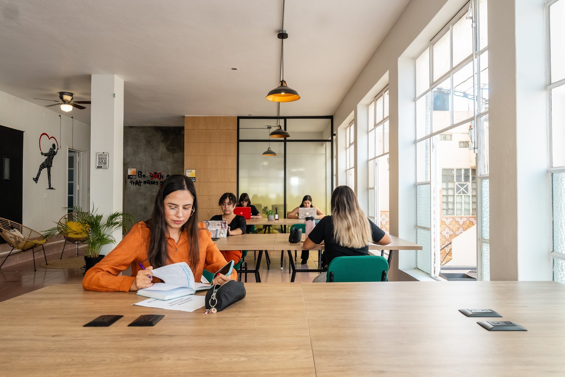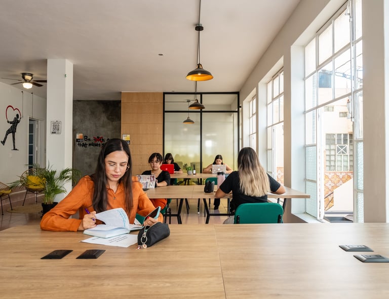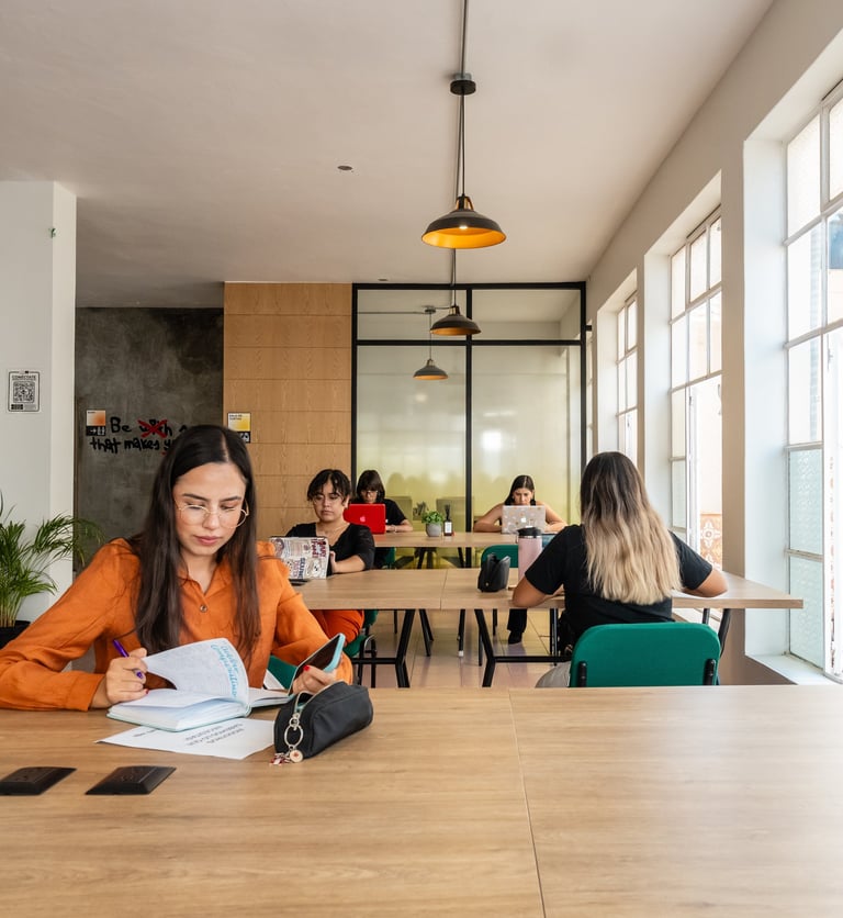 Uso de los espacios compartidos, todo listo para trabajar cuando lo necesites, ubicado en un entorno espacioso y relajado, acompañado de música ambiental que potencia la creatividad y enfoque.