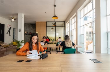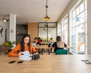 Uso de los espacios compartidos, todo listo para trabajar cuando lo necesites, ubicado en un entorno espacioso y relajado, acompañado de música ambiental que potencia la creatividad y el enfoque.